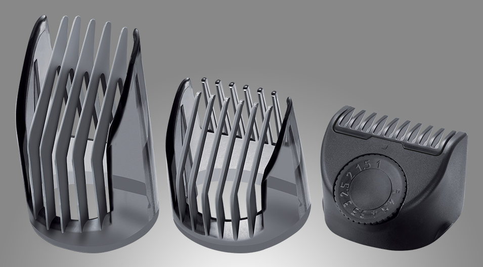 Επειδή κάθε γενειάδα είναι διαφορετική, το προηγμένο αυτό σετ περιλαμβάνει μία επιλογή από 3 χτένες για να διασφαλιστεί η πλήρης ευελιξία κατά την περιποίηση και τη διαμόρφωση του στυλ του προσώπου σας.