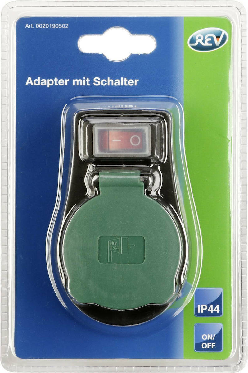 Αντάπτορας πρίζας με προστασία IP44 από ηλεκτροπληξία, πράσινου χρώματος. Ο ενσωματωμένος διακόπτης αυξάνει την ασφάλεια και την άνεση κατά τη χρήση της συσκευής.
