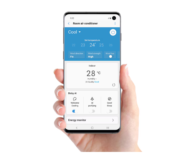 Από όπου και αν βρίσκεσαι, μπορείς να ελέγξεις τη θερμοκρασία του σπιτιού σου μέσω της εφαρμογής SmartThings ή απλά με μια φωνή! Ο έξυπνος βοηθός AI αναλαμβάνει να προσαρμόσει τις ρυθμίσεις για σένα.