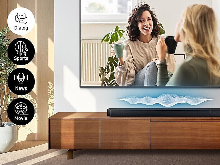 Το Samsung Soundbar προσαρμόζει αυτόματα τον ήχο για συγκεκριμένες σκηνές, προσφέροντας καθαρούς διαλόγους και ήχους ανεξαρτήτως από το περιεχόμενο ή την ένταση.