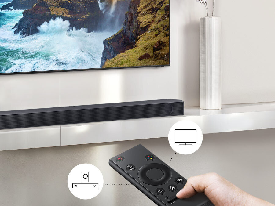 Χρησιμοποιήστε το τηλεχειριστήριο της τηλεόρασης Samsung για να ελέγξετε την τηλεόραση και τις βασικές λειτουργίες του Soundbar όπως την ενεργοποίηση, την ένταση, ακόμη και τα ηχητικά εφέ.