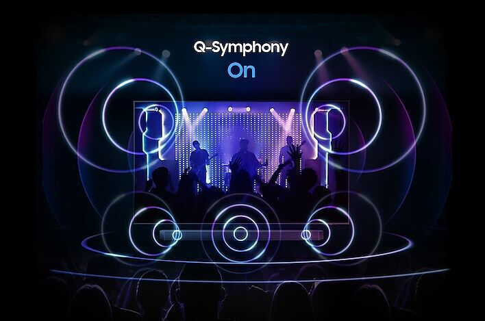 Η λειτουργία Q-Symphony προσφέρει ήχο από όλα τα κανάλια μέσω των εμπρόσθιων, πλευρικών και ανοδικής κατεύθυνσης ηχείων της τηλεόρασης και του Soundbar για καθηλωτική ακουστική εμπειρία.