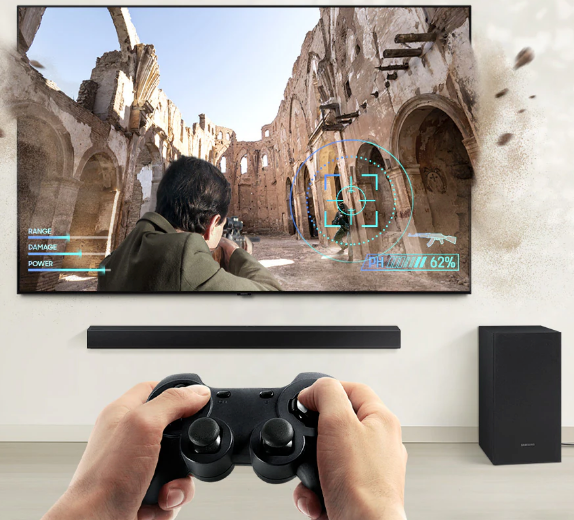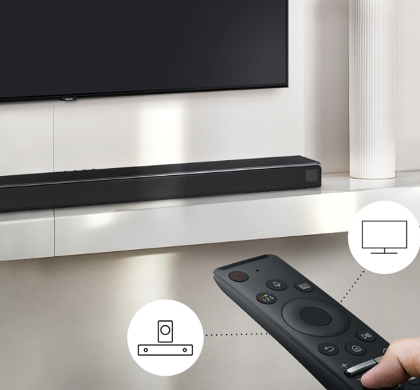 Γεμίστε το τραπεζάκι σας με ένα μόνο τηλεχειριστήριο γενικής χρήσης για να τα ελέγχετε όλα. Απολαύστε μια πλήρως συνδεδεμένη εμπειρία με το πάτημα ενός κουμπιού για να ελέγξετε πολλές συνδεδεμένες συσκευές. Το τηλεχειριστήριο Smart One της Samsung έχει τη δυνατότητα να ελέγχει περισσότερα από το soundbar σας και μπορεί να συνδεθεί με πολλές συμβατές συσκευές από την τηλεόραση μέχρι τον αποκωδικοποιητή.