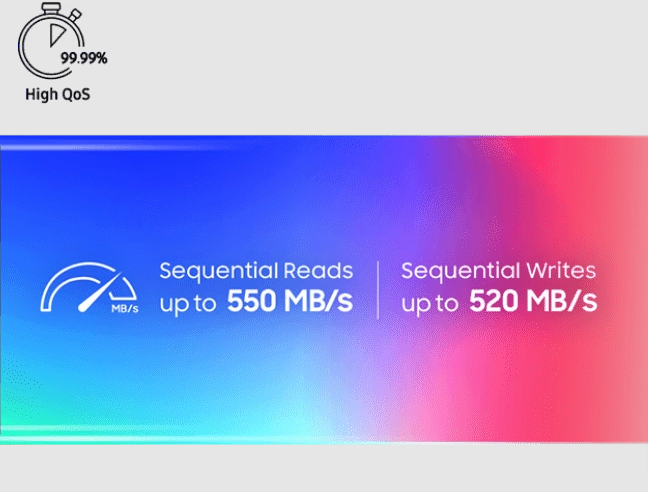 Οι ταχύτητες ανάγνωσης/εγγραφής είναι έως 550/520 MB/s και οι τυχαίεςταχύτητες ανάγνωσης/εγγραφής έως 98.000/30.000 IOPS είναι