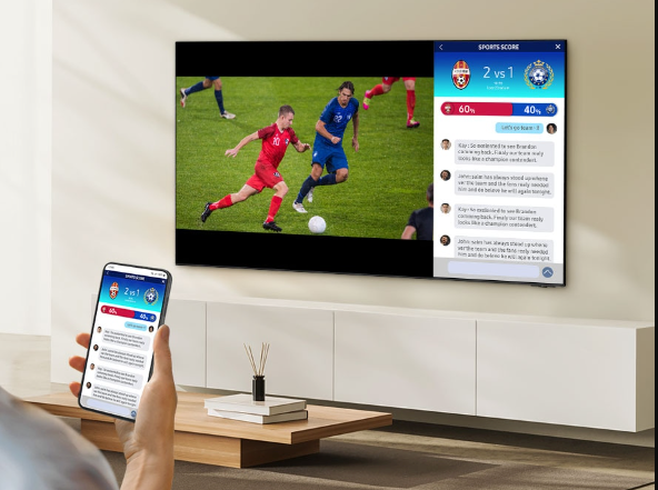 Δείτε το περιεχόμενο της τηλεόρασης και του συμβατού smartphone σας ταυτόχρονα στην ίδια οθόνη. Είτε πρόκειται για ζωντανά στατιστικά στοιχεία αγώνων είτε βίντεο για παιχνίδια, συνδέστε απλώς το συμβατό smartphone σας και απολαύστε ένα επίπεδο δυνατοτήτων πολλαπλών οθονών. Παράλληλα μπορείτε να απολαμβάνετε multitasking και να παρακολουθείτε περιεχόμενο ταυτόχρονα.