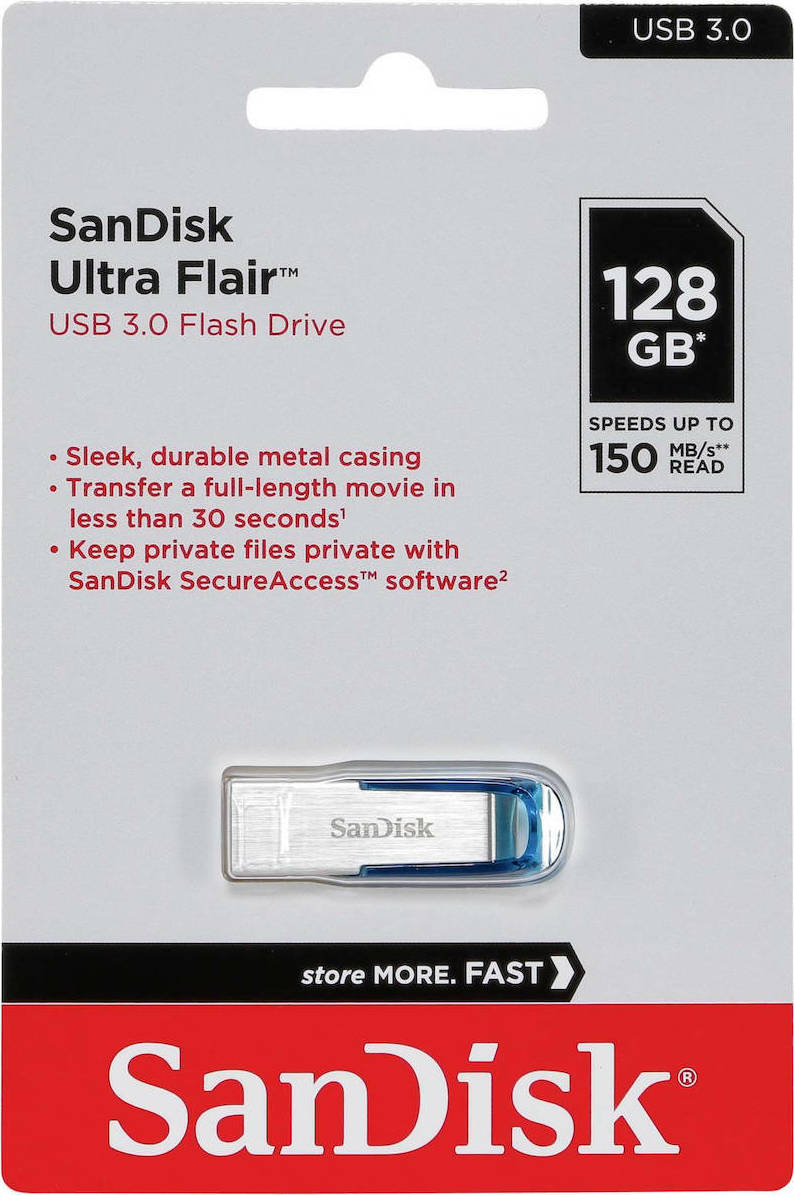 Το Flair USB drive 3.0 της SanDisk μεταφέρει τα αρχεία σας γρήγορα χάρη στη τεχνολογία USB 3.0, με επιδόσεις έως και 150MBps. Είναι κατασκευασμένο από ανθεκτικό μεταλλικό περίβλημα για να αντέχει σε χτυπήματα και πτώσεις και σας επιτρέπει να διατηρείτε ιδιωτικά τα αρχεία σας με την δυνατότητα να ορίσετε προσωπικό κωδικό πρόσβασης.