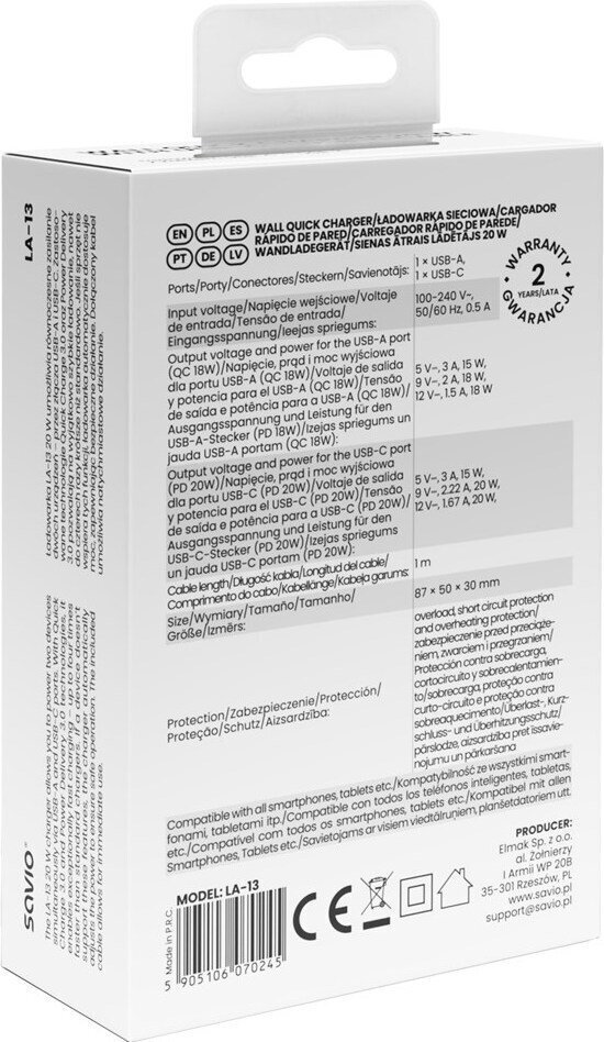 Savio Φορτιστής με Θύρα USB-A και Θύρα USB-C και Καλώδιο USB-C – USB-C 20W Power Delivery Λευκός (LA-13)