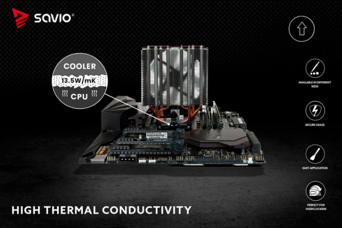 Το SAVIO TG-02 γεμίζει τέλεια τις μικροσκοπικές κοιλότητες στις επιφάνειες του επεξεργαστή και του ψυγείου. Παρέχει τέλειες παραμέτρους αγωγιμότητας. Τα μικροσωματίδια άνθρακα που περιλαμβάνονται στην πάστα καλύπτουν επαρκώς όλες τις κοιλότητες. Οδηγεί σε υψηλή θερμική αγωγιμότητα, εξασφαλίζοντας ότι η θερμότητα απομακρύνεται γρήγορα και αποτελεσματικά.