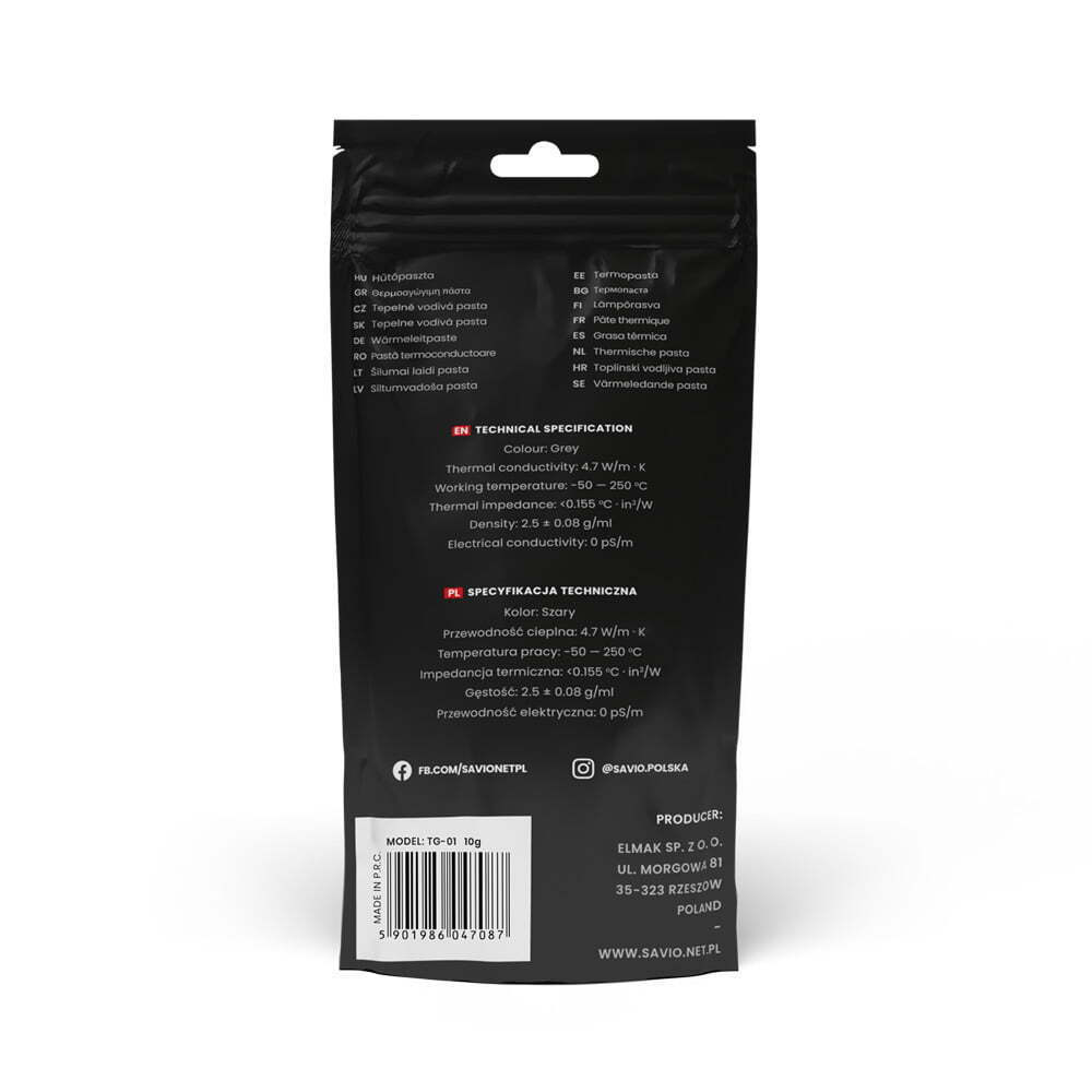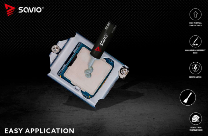 Η Thermal grease SAVIO TG-02, χάρη στη συνοχή της, απλώνεται εύκολα, ακόμη και για αρχάριους. Ένα καλά ισορροπημένο πάχος επιτρέπει τη διανομή χωρίς προβλήματα στην επιφάνεια της CPU. Το δοχείο σε μορφή σύριγγας επιτρέπει την εφαρμογή της ακριβούς ποσότητας. Η σπάτουλα που προστίθεται στο σετ βοηθά στην πρακτική εφαρμογή. Το σετ σάς επιτρέπει να το χρησιμοποιείτε με ασφάλεια πολλές φορές.