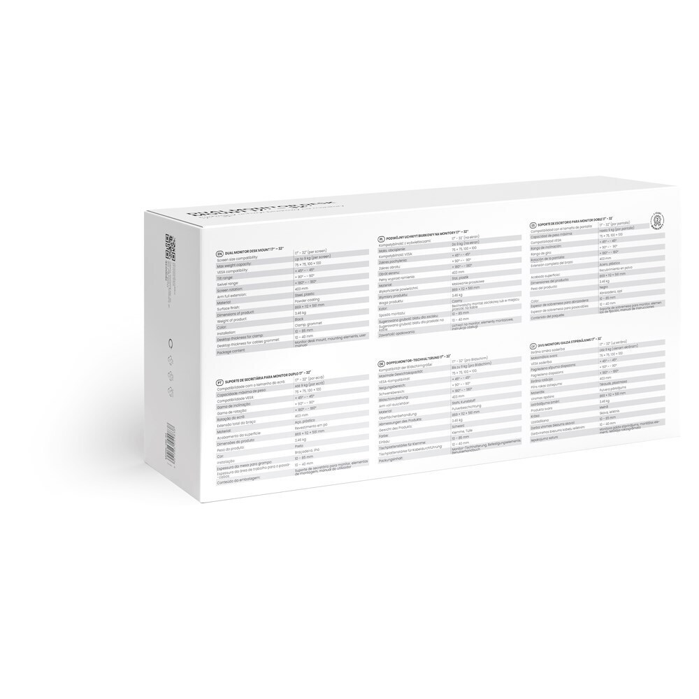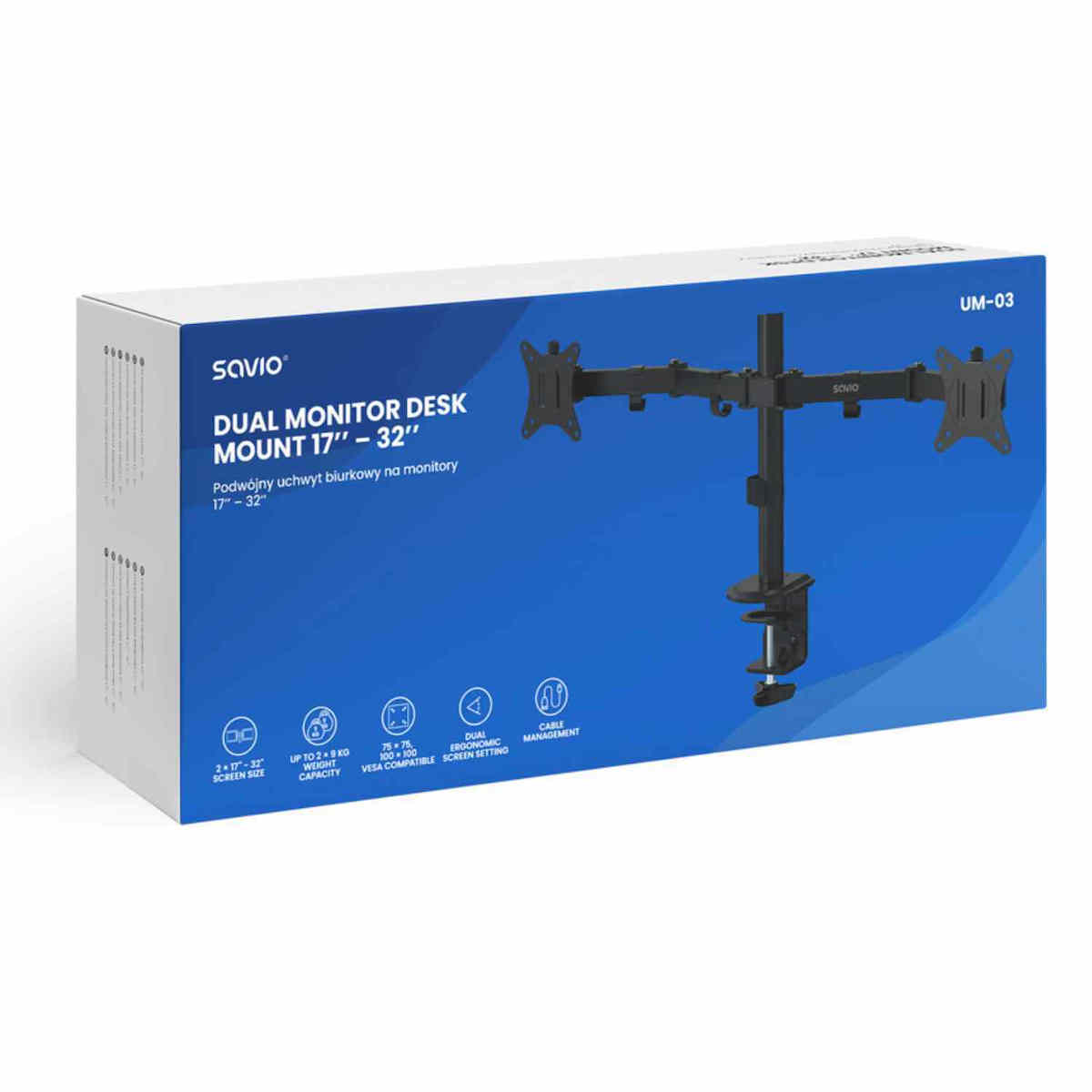 Η Savio UM-03 είναι μια εξαιρετική βάση γραφείου που επιτρέπει την εύκολη τοποθέτηση δύο οθονών, προσφέροντας έτσι μεγαλύτερη παραγωγικότητα και άνεση στην εργασία σας. Με σταθερή κατασκευή, εγγυάται ασφάλεια και αξιοπιστία για τη στήριξη των οθονών σας.