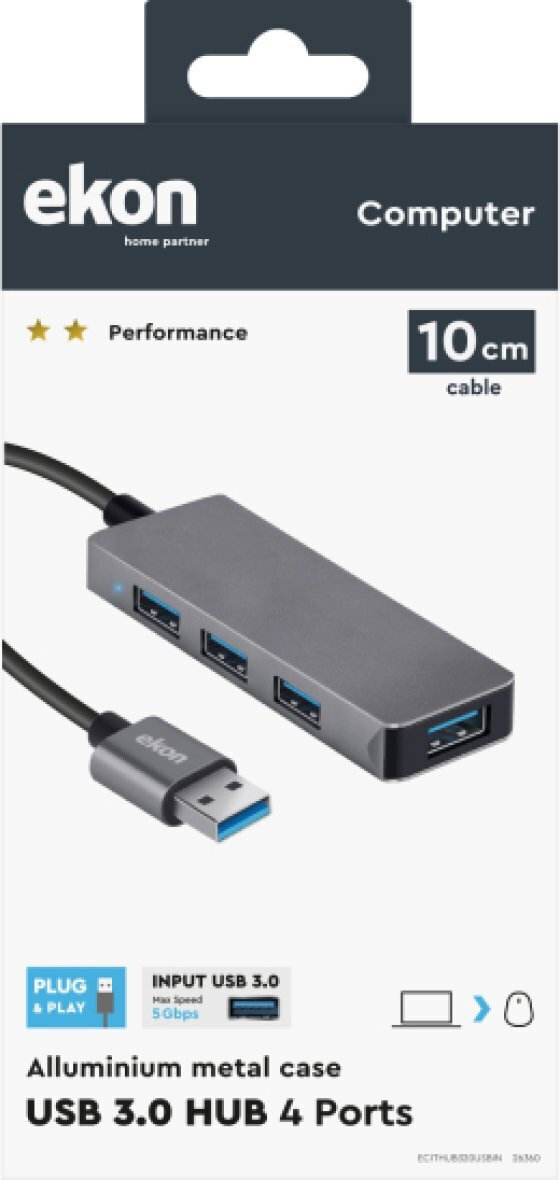 Το USB-A HUB σάς επιτρέπει να συνδέσετε έως και 4 συσκευές ταυτόχρονα. Συνδέστε το σε υπολογιστή ή φορητό υπολογιστή μέσω του ενσωματωμένου καλωδίου με υποδοχή USB-A και χρησιμοποιήστε αμέσως ένα ποντίκι, USB sticks, ένα πληκτρολόγιο και ένα καλώδιο φόρτισης χωρίς πρόβλημα.