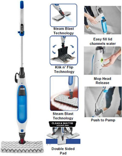 Με μία κίνηση στην κεφαλή της σφουγγαρίστρας ενεργοποιείται η λειτουργία Steam Blast, που παρέχει μια άμεση έκρηξη υπερθερμασμένου ατμού από το ακροφύσιο, μαλακώνοντας τους επίμονους ρύπους. Γυρίστε ξανά το κεφάλι προς τα πίσω και περάστε για να τους σκουπίσετε και να αφήσετε πεντακάθαρες επιφάνειες.