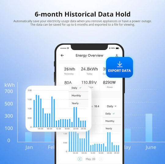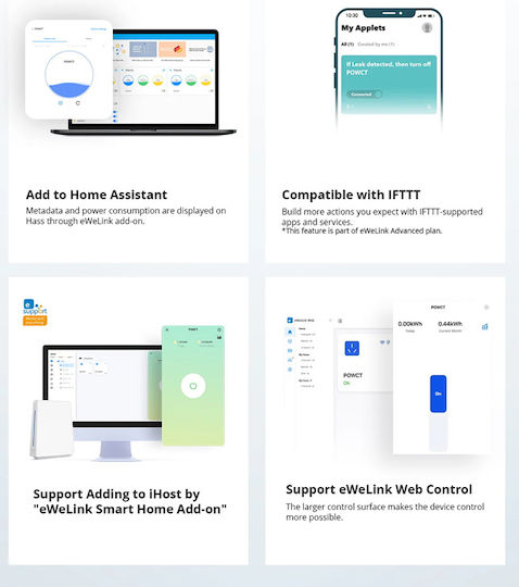 Η εφαρμογή eWeLink παρέχει ιστορικό χρήσης ηλεκτρικής ενέργειας 6 μηνών, το οποίο μπορείτε να εξάγετε στον αποθηκευτικό χώρο του τηλεφώνου σας. Υποστηρίζει φωνητικό έλεγχο μέσω Amazon Alexa και Google Assistant.