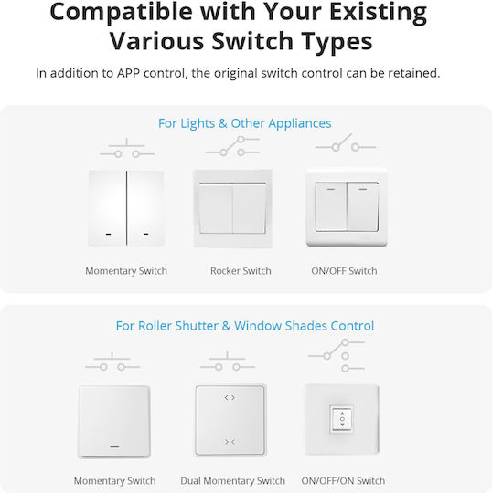 Το κύριο χαρακτηριστικό ενός smart ενδιάμεσου διακόπτη, είναι η δυνατότητά του να μετατρέπει απλές συσκευές σε smart. Συνδέστε την παροχή ρεύματος της συσκευής σας με τον διακόπτη Dual R3 Lite και ελέγξτε την μέσω Wi-Fi ή των ψηφιακών βοηθών Alexa και Google Home.