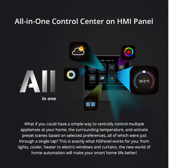 Έξυπνος διακόπτης τοίχου Sonoff NSPanel Ο έξυπνος διακόπτης τοίχου Sonoff NSPanel είναι μια σύγχρονη λύση που παρέχει ευκολία και ευελιξία στη διαχείριση των ηλεκτρικών συσκευών του σπιτιού σας. Εξοπλισμένος με διαισθητικό πίνακα αφής, συμβατότητα με συστήματα Android και iOS και δυνατότητα φωνητικού ελέγχου, ο NSPanel είναι η ιδανική λύση για όσους εκτιμούν τον εκσυγχρονισμό και την ευκολία. Το κομψό λευκό χρώμα, οι μικρές διαστάσεις του και τα υψηλής ποιότητας υλικά, όπως το σκληρυμένο γυαλί, εξασφαλίζουν τόσο την αισθητική όσο και την ανθεκτικότητα της συσκευής.