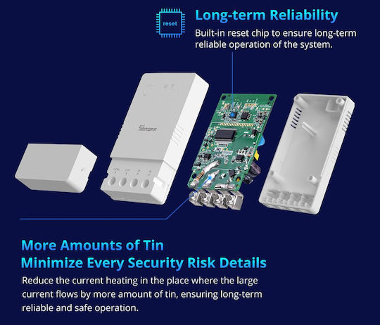 Έξυπνος διακόπτης ρελέ POWR316 της Sonoff με τον οποίο μπορείτε να ελέγχετε από το κινητό σας τις συνδεδεμένες συσκευές μέσω εφαρμογών ή φωνητικών εντολών. Επιπλέον διαθέτει συνεχή μέτρηση και αποθήκευση δεδομένων κατανάλωσης αλλά και δυνατότητες προγραμματισμού για μείωση τους, ορίζοντας συγκεκριμένες τιμές για ημερήσια, εβδομαδιαία ή μηνιαία κατανάλωση ενέργειας.