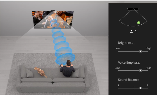 Όπου και αν είστε, όλα είναι τέλεια. Ανιχνεύοντας τη θέση σας, τη φωτεινότητα του περιβάλλοντος και την αντανάκλαση από τις συνθήκες φωτισμού του περιβάλλοντος, η BRAVIA Cam™ ρυθμίζει τη φωτεινότητα, την αντίθεση, την ισορροπία και την ένταση του ήχου.