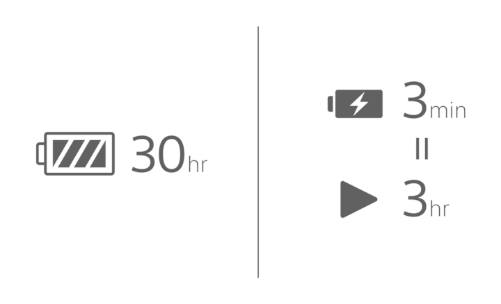 Με τεράστια διάρκεια μπαταρίας 30 ωρών, ακόμα και για ταξίδια μεγάλης διάρκειας. Αν χρειαστεί να φορτίσετε βιαστικά, με μόλις 3 λεπτά φόρτισης χρησιμοποιώντας το προαιρετικό τροφοδοτικό συμβατό με USB-PD AC, η μπαταρία διαρκεί 3 ώρες.