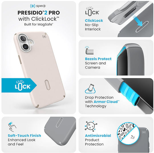 Η θήκη Speck Presidio®2 Pro MagSafe® διαθέτει την τεχνολογία ClickLock Interlock για αντικατάσταση αντιολισθητικών χαρακτηριστικών, προσφέροντας εξαιρετική προστασία. Είναι συμβατή με τα αξεσουάρ Apple MagSafe® και ενσωματώνει την τεχνολογία Armor Cloud, ανθεκτική σε πτώσεις από ύψος έως 4 μέτρα.