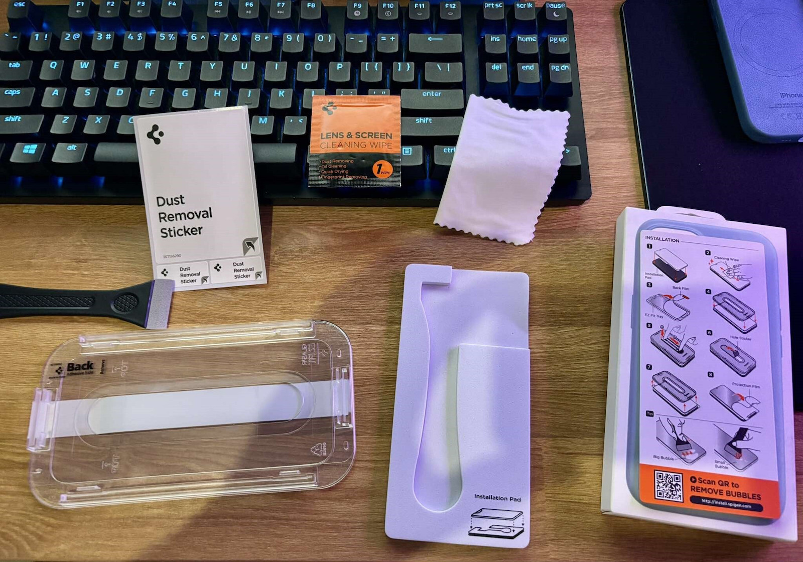 Αφού καθαρίσουμε την οθόνη του iPhone 15 με τα πανάκια καθαρισμού και τα αυτοκόλλητα απομάκρυνσης σκόνης που περιλαμβάνονται στη συσκευασία, αφαιρούμε το εσωτερικό φίλμ του γυαλιού και ευθυγραμμίζουμε το τζάμι στην οθόνη του iPhone 15 χρησιμοποιώντας τις άκρες από την κάθε πλευρά του. Αφού έχουμε ευθυγραμμίσει και αφήσει το τζάμι πάνω στην οθόνη, απλά με λίγη δύναμη πιέζουμε το κέντρο του γυαλιού.
