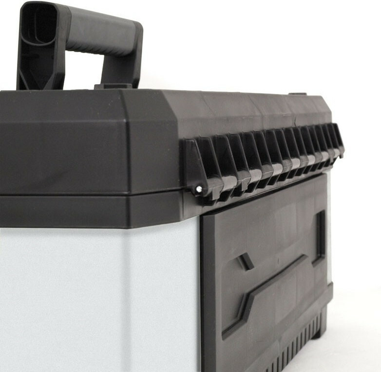 Εργαλειοθήκη χειρός πλαστική για μέγιστη ασφάλεια των εργαλείων σας. Διαθέτει καινοτόμο οριζόντιο αποθηκευτικό χώρο και εργονομική λαβή. Με ευρύχωρο μεταλλικό σώμα και καπάκι σε σχήμα “V” στο άνω μέρος για ανάγκες κοπής με πριόνι στον χώρο εργασίας.