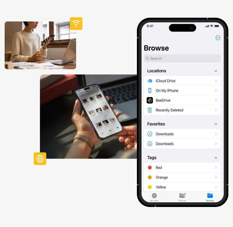 Η ενσωμάτωσή μας με την εγγενή εφαρμογή Αρχεία σάς δίνει τη δυνατότητα να προβάλλετε, να κατεβάζετε και να μοιράζεστε εύκολα αρχεία και φωτογραφίες που είναι αποθηκευμένες στο BeeDrive, είτε είστε συνδεδεμένοι μέσω Wi-Fi είτε εν κινήσει.