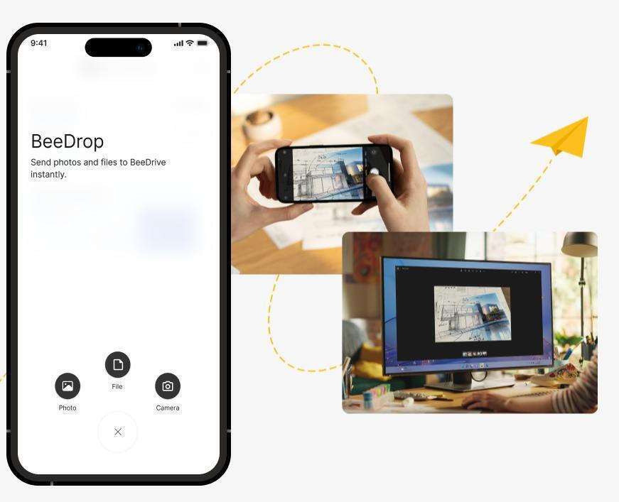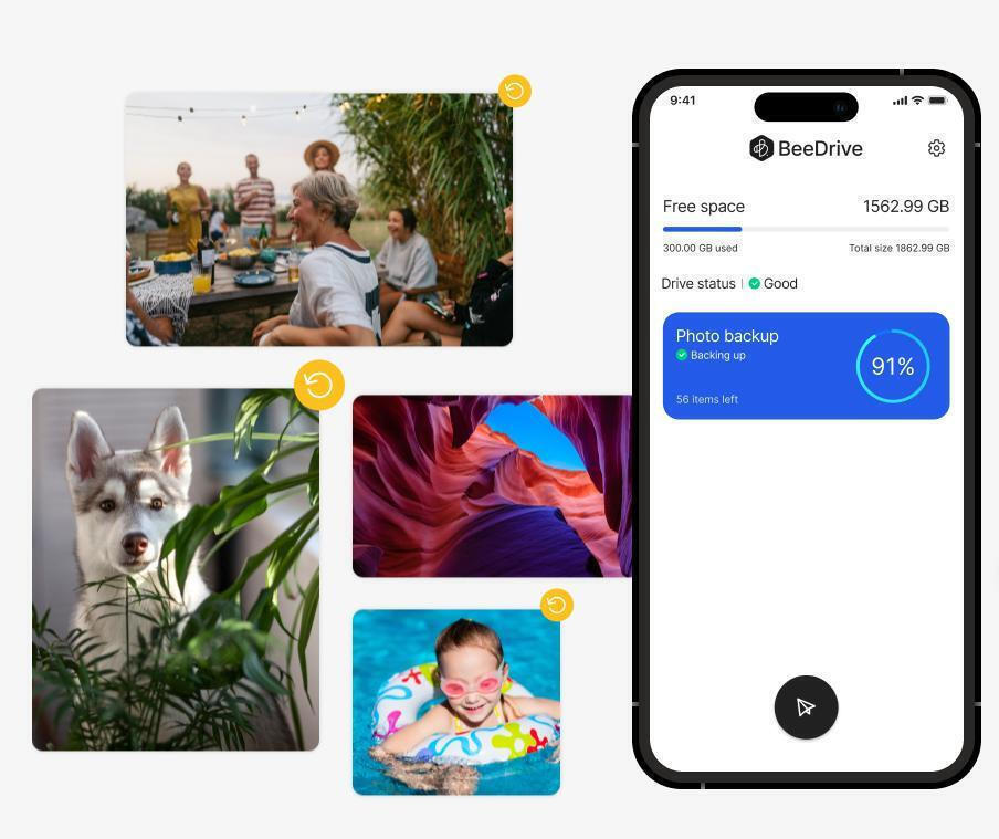 Εξαντλείτε τον αποθηκευτικό χώρο στο τηλέφωνό σας; Δημιουργήστε αντίγραφα ασφαλείας φωτογραφιών και βίντεο στο BeeDrive μέσω Wi-Fi ή κινητής τηλεφωνίας για να ελευθερώσετε τοπικό χώρο αποθήκευσης. Μπορείτε ακόμη και να δημιουργήσετε αντίγραφα ασφαλείας από απόσταση, εφόσον ο υπολογιστής σας δεν βρίσκεται σε κατάσταση αδράνειας.