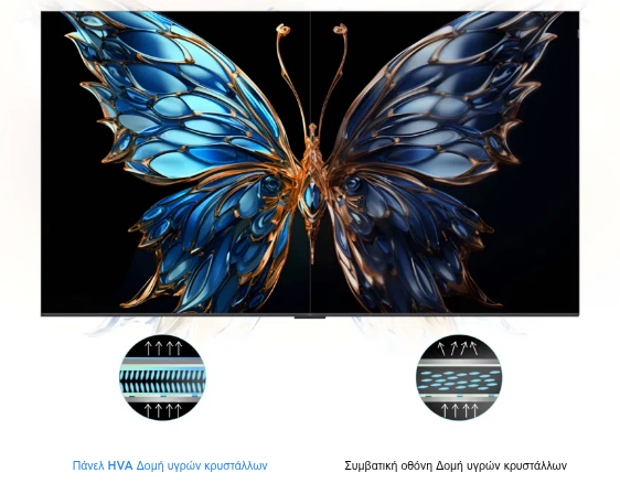 Με καινοτόμο τεχνολογία, το αυτοαναπτυγμένο πάνελ HVA της TCL δίνει έμφαση αποτελεσματικά στην ισχυρότερη και ακριβέστερη αντίθεση, ενώ παράλληλα αφαιρεί το φωτοστέφανο και τις παρεμβολές από το περιβάλλον φως, παρουσιάζοντας μια πιο καθαρή και λεπτομερή, εκπληκτική ποιότητα εικόνας.