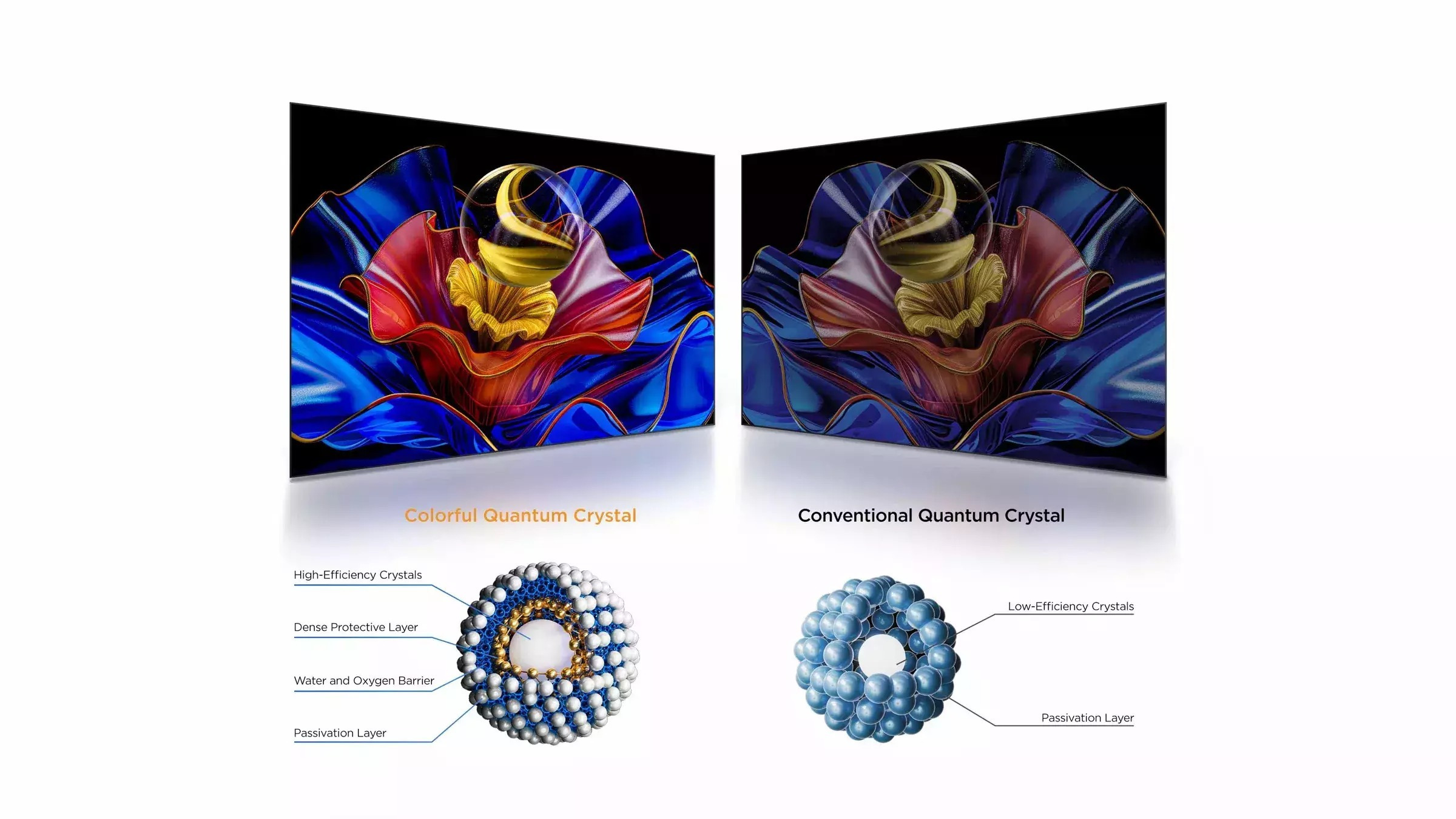 Η TCL QLED εισάγει την επόμενη γενιά του πολύχρωμου κβαντικού κρυστάλλου, που διαθέτει μια πιο σταθερή νανοπροστασία πολλαπλών στρώσεων και επεξεργασία ακριβείας. Αυτή η καινοτομία προσφέρει μια εξαιρετική, μακράς διάρκειας χρωματική εμπειρία με εξαιρετική φωτεινότητα και βάθος.