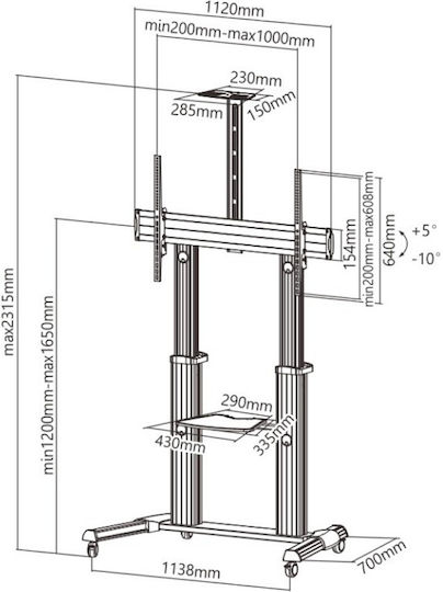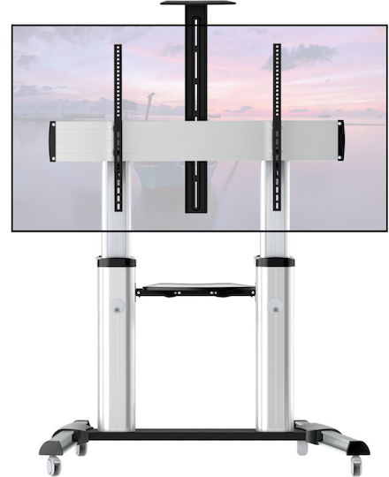Κινητή βάση LCD/LED για τηλεοράσεις από 60 έως 100 ίντσες με μέγιστη χωρητικότητα φορτίου 100 kg. Κατασκευασμένη από χάλυβα και αλουμίνιο, διαθέτει ρυθμιζόμενο ύψος (1200 – 1650 mm) και υποστηρίζει πρότυπα VESA έως 1000×600. Η βάση διαθέτει ρύθμιση κλίσης έως -10°. Ενσωματωμένο σύστημα διαχείρισης καλωδίων και 4 τροχούς με κλειδαριά για εύκολη μετακίνηση.