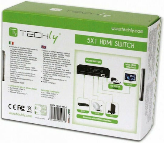 Το Techly IDATA HDMI-4K51 είναι ένα HDMI switch που σας επιτρέπει να μοιράζεστε HDMI πηγές με μία HD οθόνη. Σας δίνει τη δυνατότητα να κάνετε εύκολα εναλλαγή μεταξύ 5 HDMI πηγών όπως BlueRay player, DVD player και κονσόλες παιχνιδιών σε μια τηλεόραση με HDMI είσοδο. Μεταδίδει τα ψηφιακά και ακουστικά σήματα μέσω της HDMI σύνδεσης.