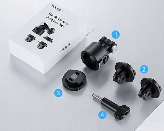 Στήριγμα TELESIN γρήγορης τοποθέτησης. Αυτή η βάση σας επιτρέπει να τοποθετήσετε διάφορα αξεσουάρ στην αθλητική σας κάμερα με ακόμα μεγαλύτερη ευκολία. Το σετ TELESIN περιλαμβάνει:
