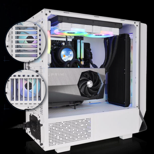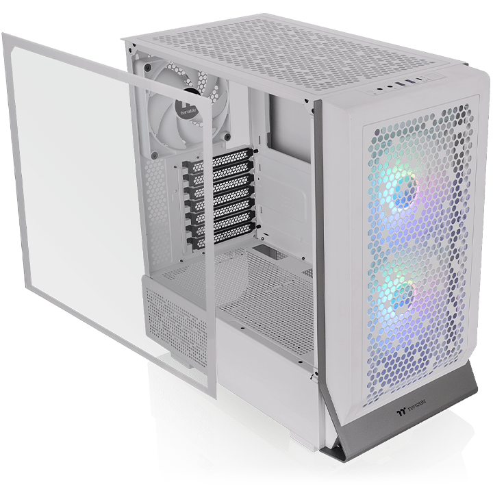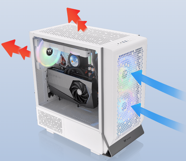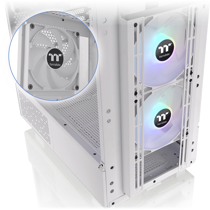 Η απόδοση ψύξης του Ceres 300 TG ARGB Snow είναι αξιοσημείωτη χάρη στους δύο CT140 ARGB Sync PC Cooling Fans White που είναι προεγκατεστημένοι στο μπροστινό μέρος και έναν CT140 PC Cooling Fan White που είναι προεγκατεστημένος στο πίσω μέρος. Εκτός αυτού, περισσότερο από το 55% των πάνελ του είναι διάτρητα, παρέχοντας τεράστια ροή αέρα μέσω των διάτρητων εγκοπών του.