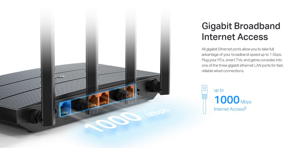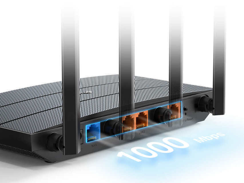 Όλες οι θύρες Gigabit Ethernet σας επιτρέπουν να εκμεταλλευτείτε πλήρως την ευρυζωνική σας ταχύτητα έως και 1 Gbps. Συνδέστε τους υπολογιστές σας, τις έξυπνες τηλεοράσεις και τις κονσόλες παιχνιδιών σε μία από τις τρεις θύρες gigabit ethernet LAN για γρήγορες, αξιόπιστες ενσύρματες συνδέσεις.