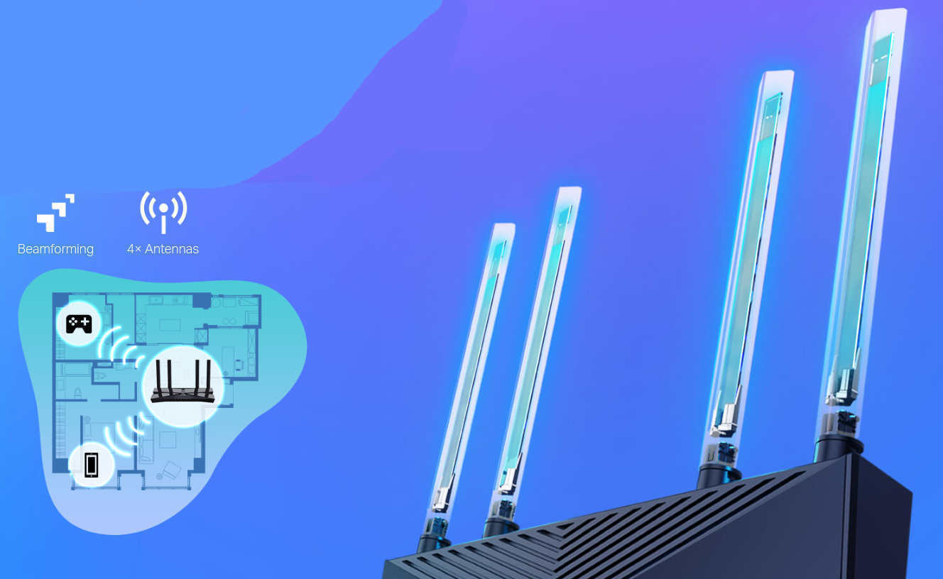 Οι 4× εξωτερικές κεραίες υψηλής απόδοσης ενισχύουν τα σήματα WiFi σε όλο το σπίτι σας. Η τεχνολογία Beamforming ανιχνεύει τις συσκευές και συγκεντρώνει την ισχύ του ασύρματου σήματος προς αυτές, ειδικά για τις συσκευές που βρίσκονται σε δυσπρόσιτες μέχρι πρότινος περιοχές.