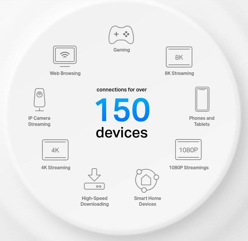 Το πιο πρόσφατο 1024-QAM ενισχύει ταχύτητες έως και 3,0 Gbps — ιδανικό για εργασίες με απαιτήσεις εύρους ζώνης, όπως gaming cloud και βίντεο 8K. Οι οικογένειες θα απολαμβάνουν καθηλωτική ζωντανή ροή με άψογο βίντεο και καθαρό ήχο χωρίς buffer.
