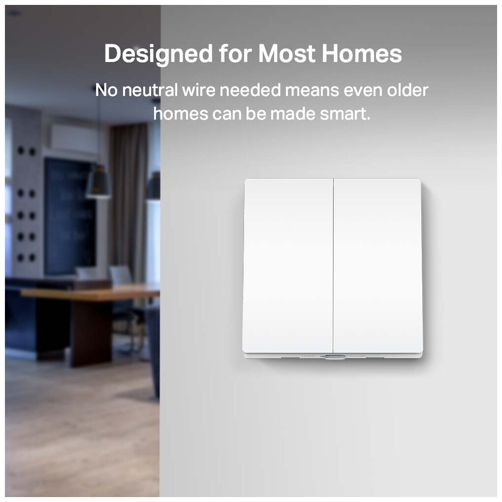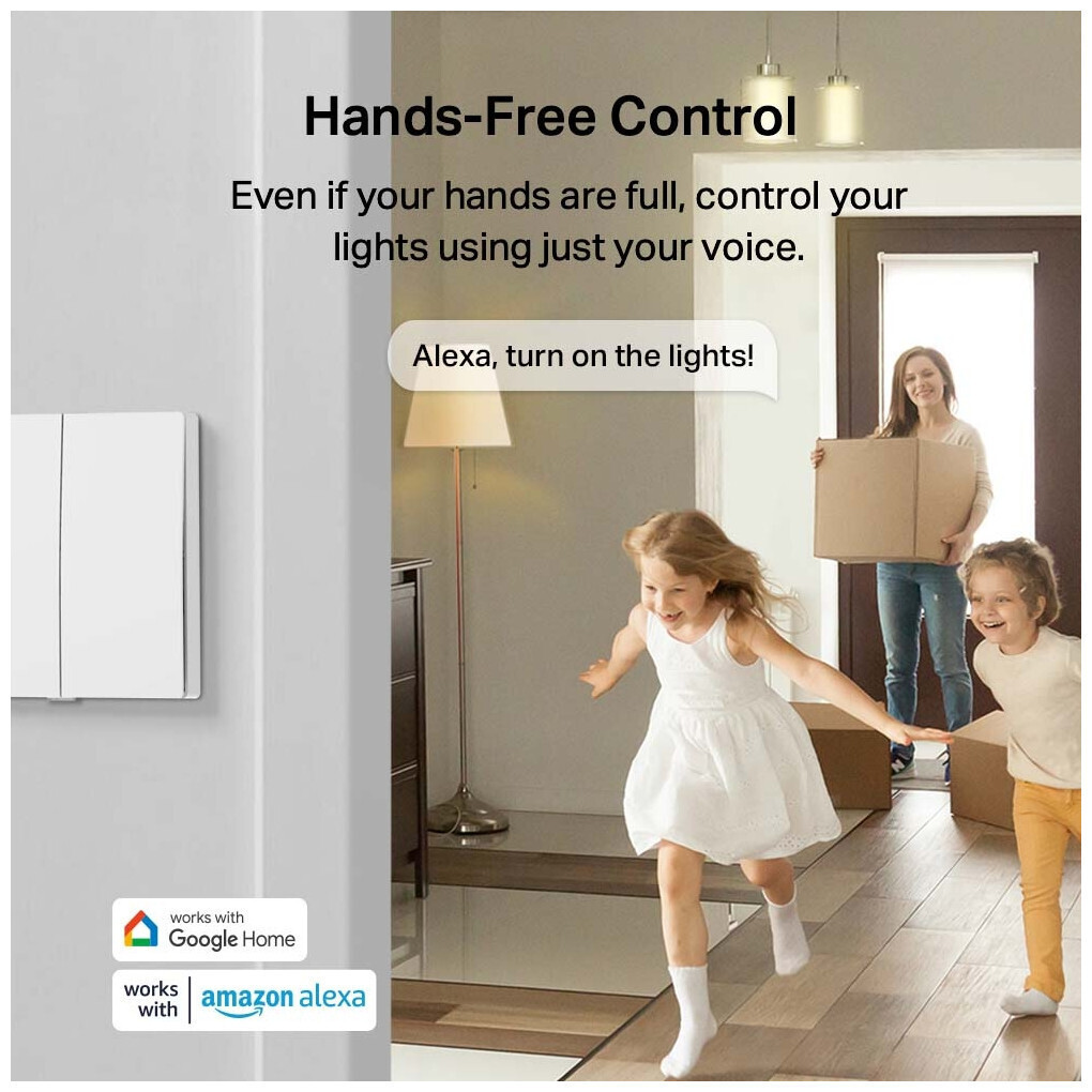 Διπλός χωνευτός διακόπτης τοίχου της TP-LINK, απλός, σε λευκό χρώμα. Περιλαμβάνει τον μηχανισμό και τη μετώπη του διακόπτη, χωρίς πλαίσιο. Χρησιμοποιείται για τον έλεγχο του φωτισμού σας. Μπορεί να συνεργαστεί με άλλες έξυπνες συσκευές μέσω της εφαρμογής Alexa και του Google Home.