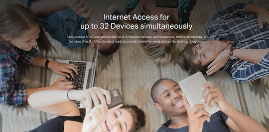 Μοιραστείτε εύκολα μια σύνδεση 3G / 4G με έως και 32 ασύρματες συσκευές, όπως τηλέφωνα, tablet και φορητούς υπολογιστές ταυτόχρονα. 4 θύρες LAN είναι έτοιμες να παρέχουν internet για ενσύρματες συσκευές όπως επιτραπέζιους υπολογιστές.