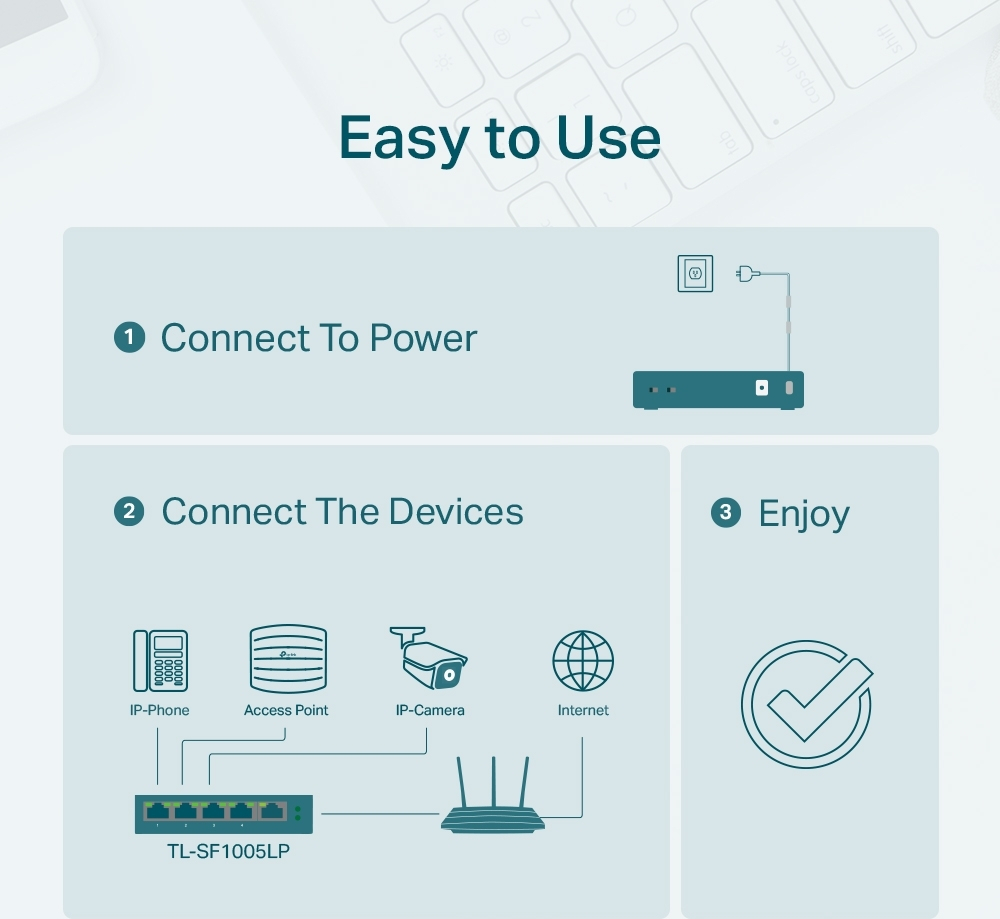 Η συμμόρφωση με το πρότυπο 802.3af PoE υποστηρίζει έως και 15,4 W σε κάθε θύρα PoE. Ο συνολικός προϋπολογισμός ισχύος 41 W PoE* για τις θύρες 4× PoE ανοίγει ένα ευρύ φάσμα εφαρμογών, όπως η επιτήρηση για γραφεία, rack και μικρές επιχειρήσεις. Είναι πλήρως συμβατό με κάμερες IP, σημεία πρόσβασης, τηλέφωνα IP, υπολογιστές, εκτυπωτές και πολλά άλλα.