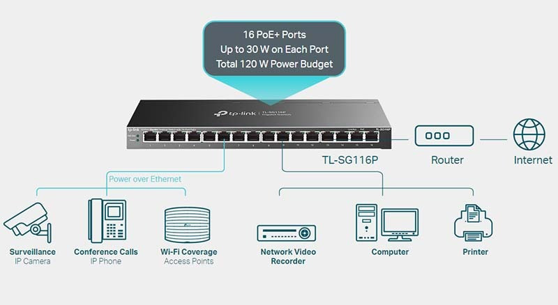 Η συμμόρφωση με το πρότυπο 802.3af/at PoE+ υποστηρίζει έως και 30 W σε κάθε θύρα PoE. Ο συνολικός προϋπολογισμός ισχύος 120 W PoE για τις θύρες PoE+ 16× ανοίγει ένα ευρύ φάσμα εφαρμογών, όπως επιτήρηση για γραφεία, κοιτώνες και μικρές επιχειρήσεις. Είναι πλήρως συμβατό με κάμερες IP, σημεία πρόσβασης, τηλέφωνα IP, υπολογιστές, εκτυπωτές και άλλα.