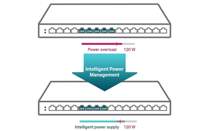 Όταν η συνολική κατανάλωση ενέργειας υπερβαίνει τα 120 W, η έξυπνη διαχείριση ενέργειας θα μειώσει την ισχύ της θύρας χαμηλότερης προτεραιότητας. Αυτό διασφαλίζει την παροχή ρεύματος της θύρας υψηλής προτεραιότητας και προστατεύει τη συσκευή από υπερφόρτωση ρεύματος. Επίσης, ανιχνεύει αυτόματα και παρέχει την απαιτούμενη ισχύ για τις συσκευές PoE σας ενώ προστατεύει τον εξοπλισμό σας PoE και μη PoE από ζημιά.