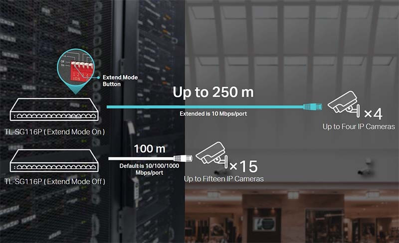 Με τη λειτουργία επέκτασης, η απόσταση μετάδοσης PoE φτάνει έως και τα 250 m – ιδανική για ανάπτυξη κάμερας IP σε μεγάλες περιοχές.