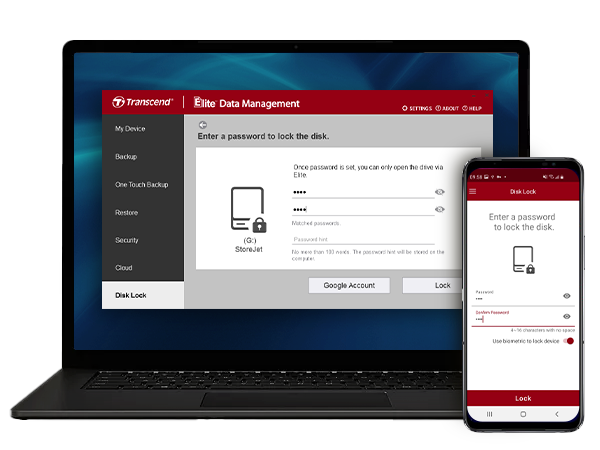 Οι συσκευές αποθήκευσης της Transcend παρέχουν αποκλειστικές λειτουργίες κλειδώματος δίσκου και ασφάλειας, οι οποίες λειτουργούν τόσο σε συστήματα Windows όσο και σε συστήματα Android. Με το λογισμικό Transcend Elite, μπορείτε να προστατεύσετε ολόκληρη τη μονάδα δίσκου και τα αρχεία που βρίσκονται μέσα σε αυτήν με κωδικούς πρόσβασης, ανταποκρινόμενοι στα υψηλά πρότυπα ασφάλειας πληροφοριών.