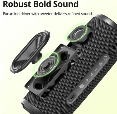 Ασύρματο φορητό ηχείο της Tronsmart για να σας συντροφεύει παντού, με εξαιρετική ποιότητα ήχου. Εξοπλίζεται με ενσωματωμένη, επαναφορτιζόμενη μπαταρία χωρητικότητας 5200mAh, που προσφέρει έως 18 ώρες αναπαραγωγής μουσικής. Η σύνδεση του για την αναπαραγωγή της μουσικής γίνεται ασύρματα μέσω Bluetooth. Υποστηρίζει TWS λειτουργία για ταυτόχρονη σύνδεση 2 ηχείων και φορτίζει μέσω USB-C θύρας.