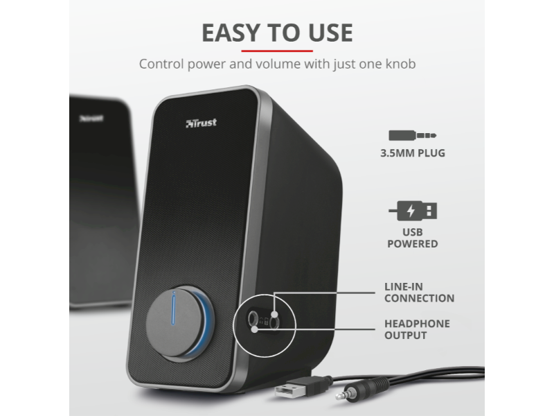 Το ηχείο Trust Arys τροφοδοτείται μέσω USB, πράγμα που σημαίνει ότι μπορείτε να εγκαταστήσετε τα ηχεία πολύ εύκολα. Απλώς συνδέστε το καλώδιο USB στον υπολογιστή σας και συνδέστε το βύσμα υποδοχής 3,5 mm και το ηχείο θα διοχετεύσει όλους τους ήχους σας.