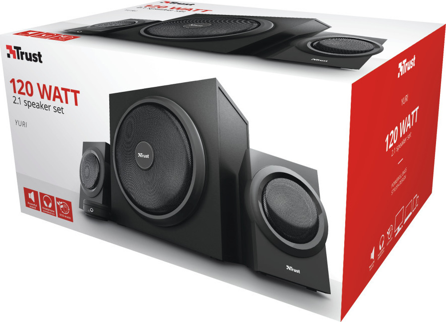 To σετ ηχείων Trust Yuri 2.1, διαθέτει μέγιστη ισχύ 120W για ισχυρό ήχο και ξύλινο subwoofer 5.25” για δυναμικά μπάσα.