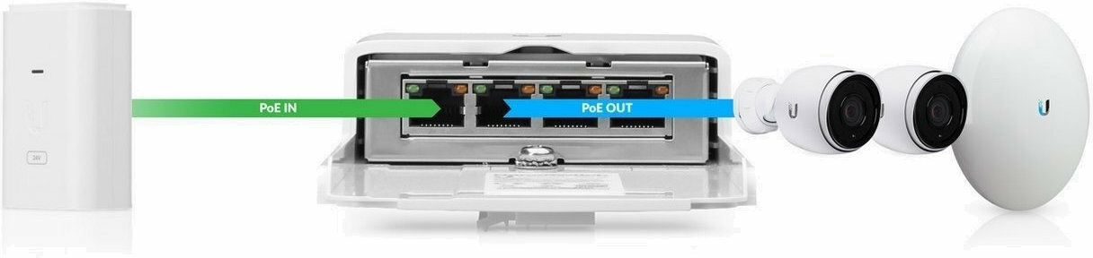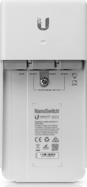 Τροφοδοτείται από 24V Passive PoE και παρέχει έως και 24W ισχύ σε τρεις θύρες εξόδου PoE. Το NanoSwitch έχει σχεδιαστεί για ανάπτυξη σε εξωτερικούς χώρους και υποστηρίζει συνολικό ρυθμό γραμμής χωρίς αποκλεισμό έως 4 Gbps.