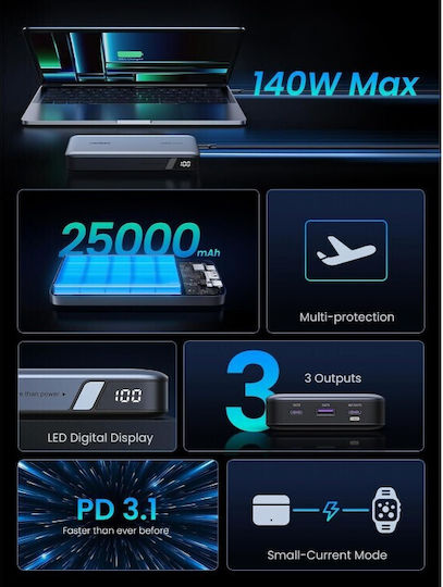 Το power bank της Ugreen έχει χωρητικότητα 25000mAh που μπορεί να προσφέρει τουλάχιστον 4 φορτίσεις σε ένα συνηθισμένο κινητό τηλέφωνο. Διαθέτει μία θύρα USB-A, 2 θύρες USB-C και μπορεί να φορτίσει μία συσκευή με έως και 3Α. Οι τεχνολογίες γρήγορης φόρτισης Power Delivery και Quick Charge 3.0 του επιτρέπουν να φορτίσει τις συσκευές σας (εφόσον υποστηρίζουν και αυτές την αντίστοιχη τεχνολογία) σε μικρότερο χρόνο.