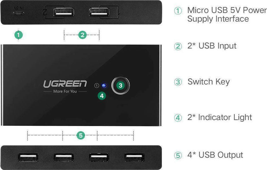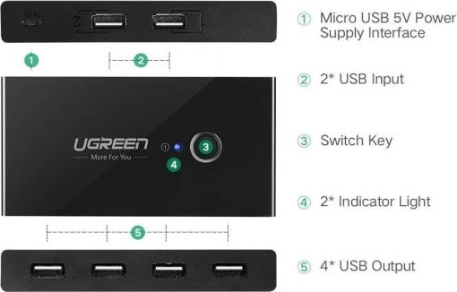 Μοιράσου 4 USB συσκευές σε 2 υπολογιστές. Εύκολη εναλλαγή μεταξύ 2 υπολογιστών με το πάτημα ενός κουμπιού, το LED υποδεικνύει ποιος Η/Υ είναι σε ισχύ. Τροφοδοτείται μέσω θύρας Micro USB.