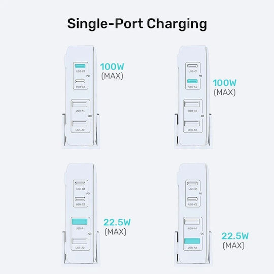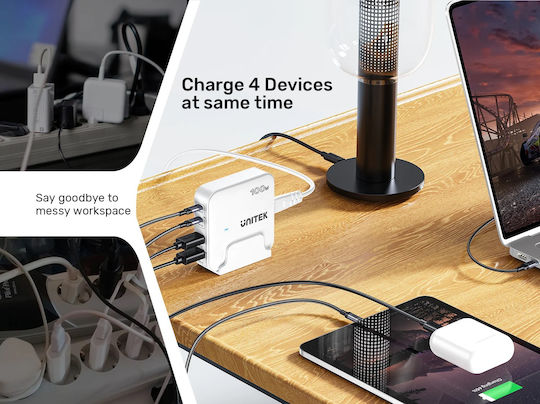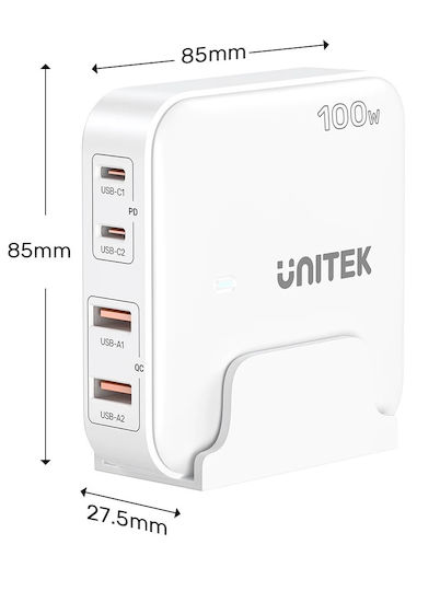 Unitek Φορτιστής Χωρίς Καλώδιο GaN με 2 Θύρες USB-A και 2 Θύρες USB-C 100W Quick Charge 3.0 Λευκός (P1229AWH)